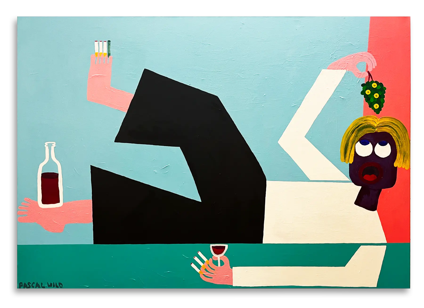 Pascal Wild (born 1991 in Darmstadt, lives and works in Berlin) studied Communication Design in Mannheim and later developed his artistic practice outside formal art education, cultivating a distinct visual language that oscillates between innocence and excess, humour and melancholy. Working with oil, acrylic, spray paint, and pastel, he creates vivid, pop-inflected compositions populated by cartoon-like figures and oversized heads that recall the immediacy of children’s drawings. Beneath their playful facade lies a psychological depth touching on dependency, transience, intoxication, and existential emptiness.
